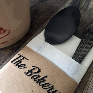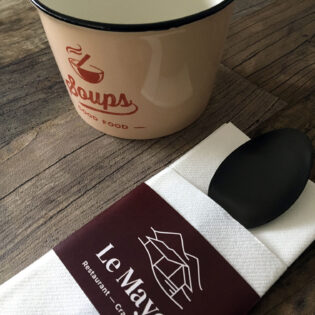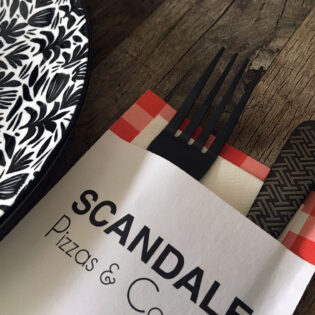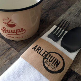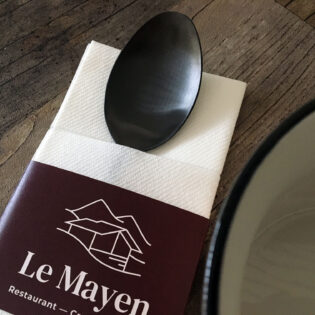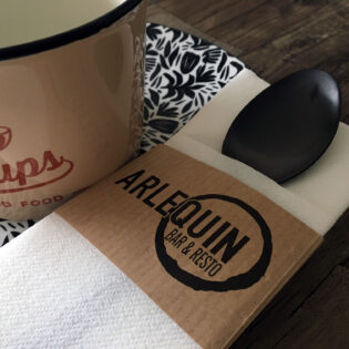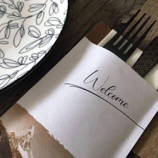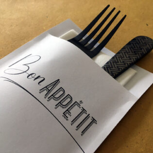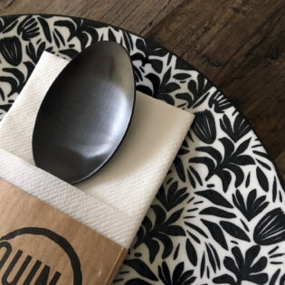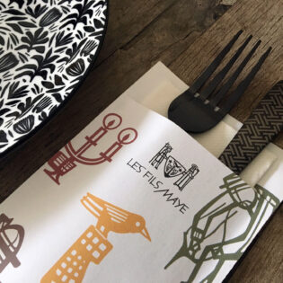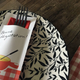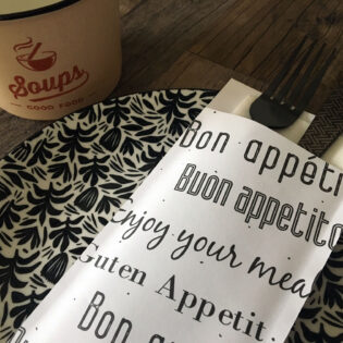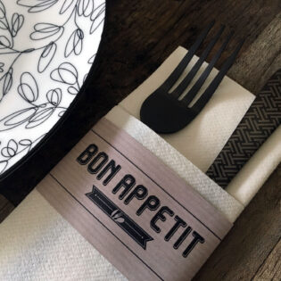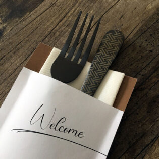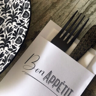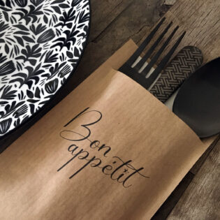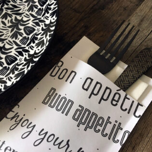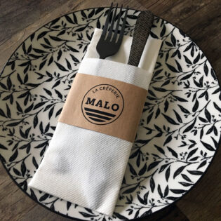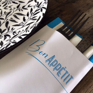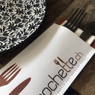 Vous avez envie d’une pochette à couverts personnalisée ? Ou préférez-vous opter pour une serviette airlaid avec un pliage kangourou et un ruban en papier imprimé? N’hésitez pas à nous contacter!